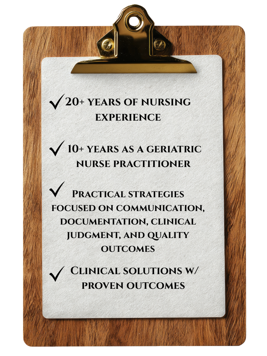 Doctorate-level clinical insight, real-world geriatric expertise, and practical education designed to strengthen care delivery, team performance, and professional readiness.