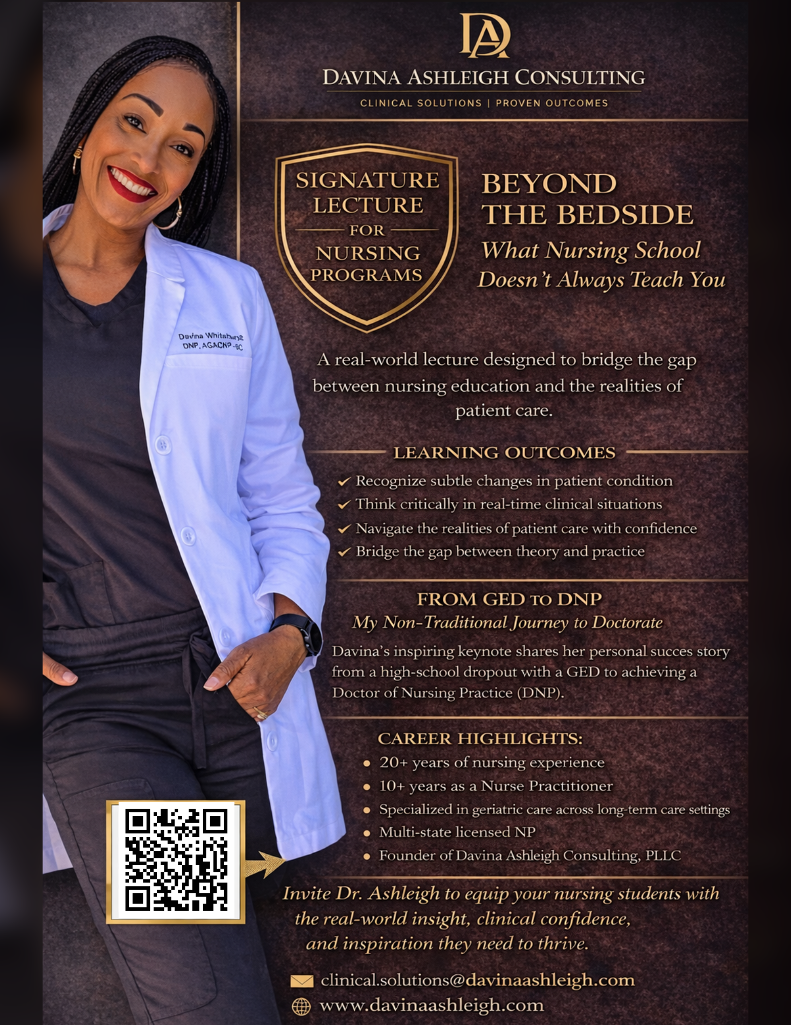 Dr. Davina provides high-impact speaking and workshops for schools, facilities, and healthcare audiences seeking stronger communication, sharper clinical judgment, and better readiness for practice.